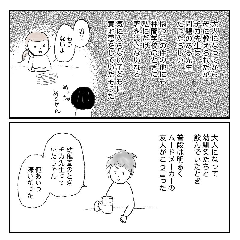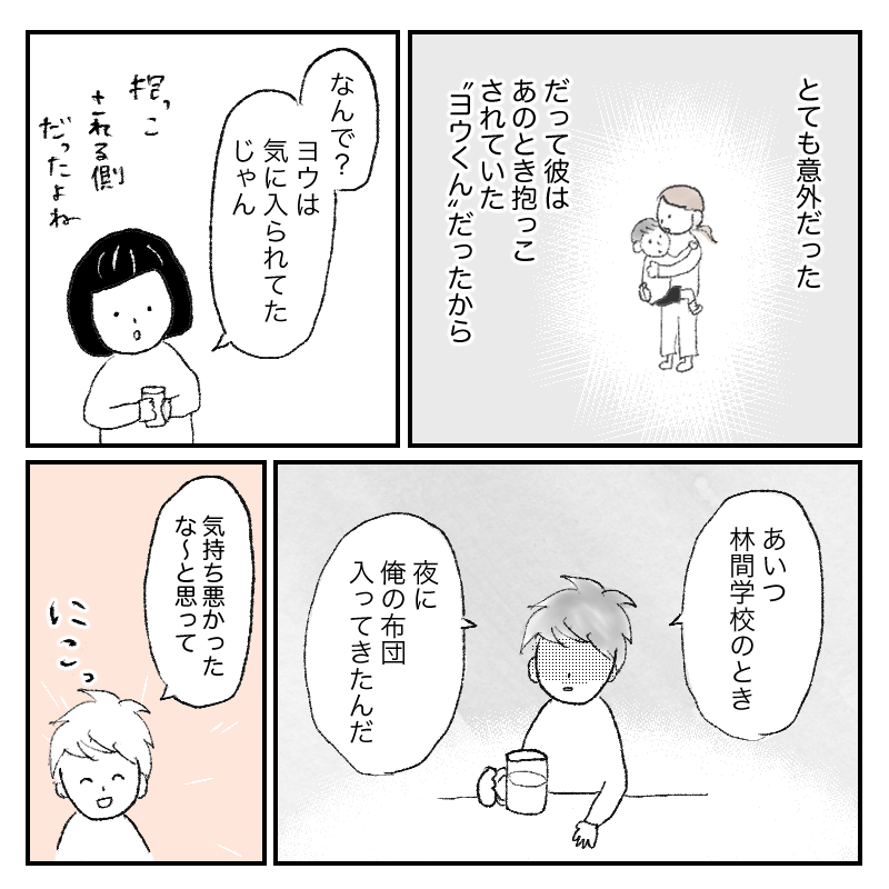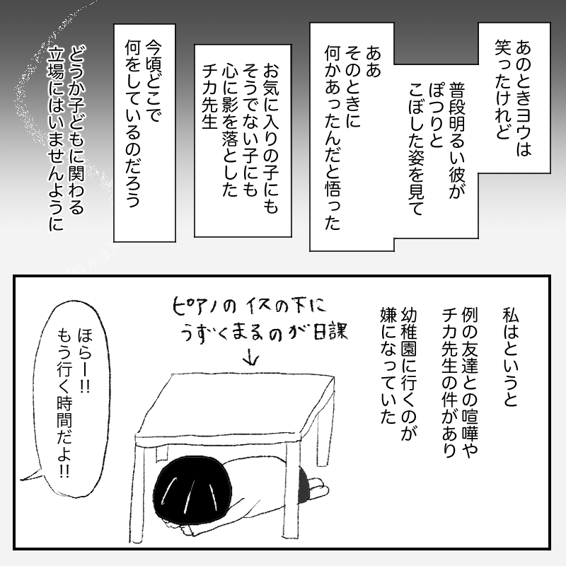 林間学校(お泊まり保育みたいなもの)のとき、チカ先生に添い寝されたヨウは、何をされたかはっきりとは言わなかったものの、明るい彼があんな風に口をつぐむ姿を初めて見ました。
