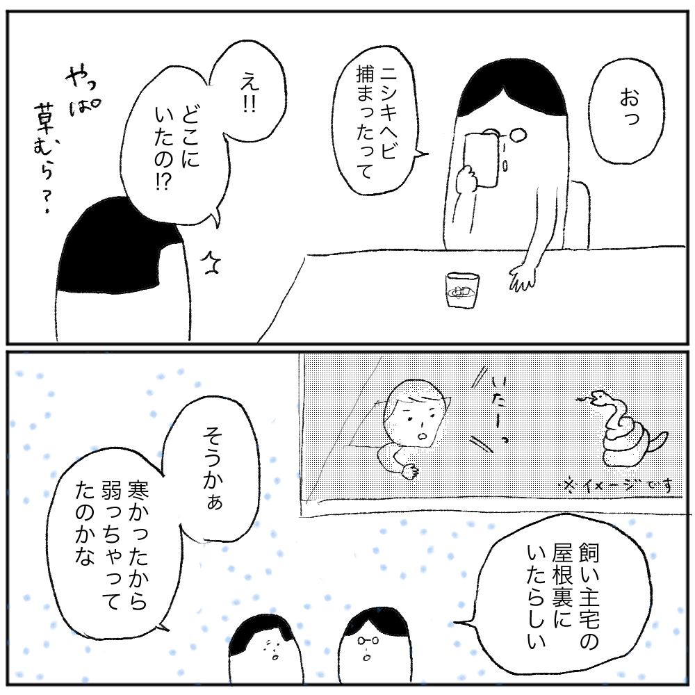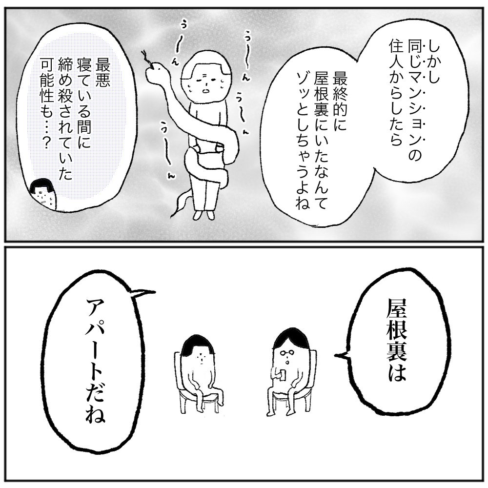 ニシキヘビが屋根裏にいたことで、近隣住民は更にヒヤッとしただろうね〜!という、たわいない会話をしたかっただけなんです。