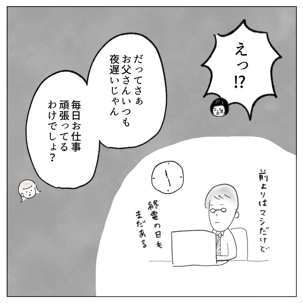 コロナ由来の休園の日には、休憩時間に外に連れ出したり、お昼寝のために寝かしつけたり、機嫌の悪い時間は仕事を中断して相手したり…と自分なりに向き合ってきたつもりですが、お外で遅くまで働いているお父さんの方が頑張っているように見えるわけですね。