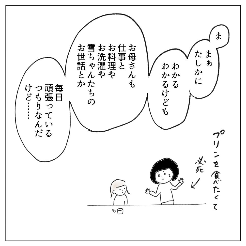 料理も洗濯も、お風呂や仕上げの歯磨きも全部私なのに、それが雪ちゃんの目には「いつも家にいる人」というイメージがついている模様。